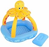 aufblasbarer Beckenboden.Planschbecken 102cm Durchmesser.uvcareful Sonnendach UPF 50+.inkl. aufblasbarem Kissen.robustes, 0,22mm/0,24mm starkes Vinyl. UV-Schutz Planschbecken „Octopus Pool“ mit Sonnendach UPF 50+ 102cm x 102cm x 102cm Das uvcareful™ UPF 50+ (Ultra-Violet Protection Faktor) Octopus Sonnendach schützt Sie und Ihre Kinder vor übermäßiger UV-Strahlung.Eine „Überdosis“ UV-Strahlung verursacht nicht nur schmerzhaften Sonnenbrand, sondern auch nachhaltige und nicht sofort sichtbare Hautschädigungen, die langfristig frühzeitige Hautalterung, oder schlimmsten Falls Hautkrebs zur Folge haben können.Ebenso kann exzessives Sonnenbaden Augenkrankheiten wie den „grauen Star“ verursachen. Kleine Kinder können die Gefahr, die von der Sonne ausgeht, nicht verstehen, aber Eltern können es! Dass Sonnenschutz richtig Spaß machen kann, zeigt der niedliche Bestway Octopus Pool von Bestway für Kinder von 12-24 Monaten. Das aufblasbare Sonnendach schützt Ihre Kinder optimal vor direkter Sonnenstrahlung. Der aufblasbare Beckenboden bietet gepolsterten Badekomfort.